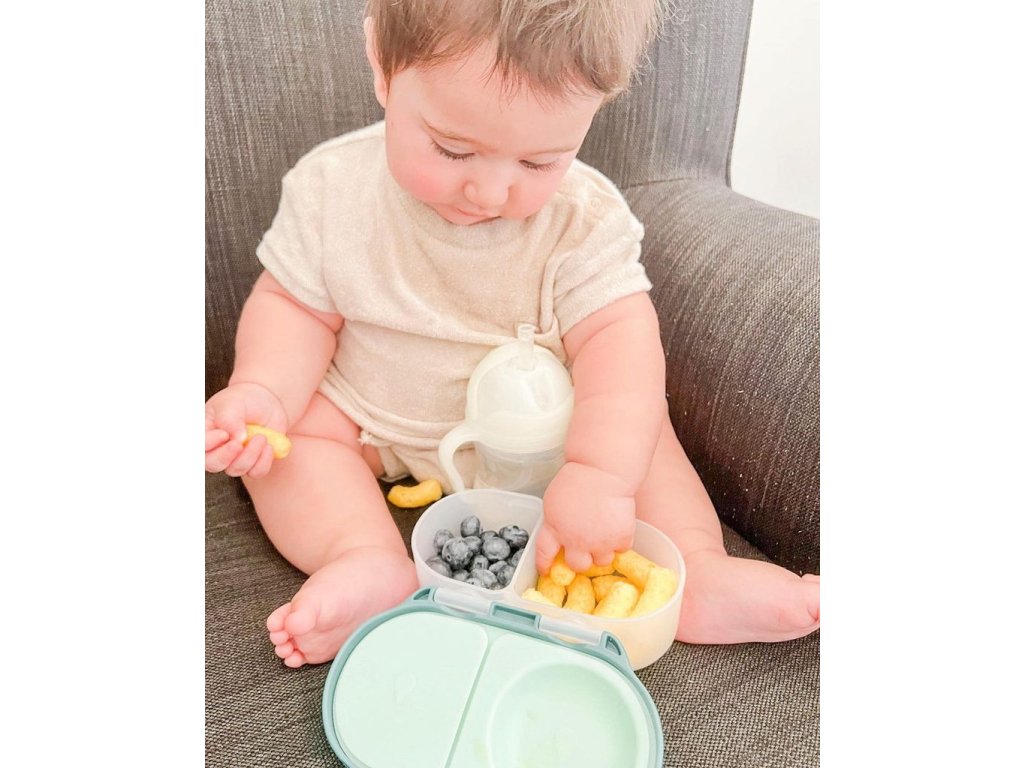 Díky flexibilnímu silikonovému víčku na jedné straně můžete do krabičky vložit celý kus ovoce (např. jablko) a do druhé třeba i jogurt nebo pyré (nikoliv tekutiny). Jednoduché otevírání umožní dětem samostatně se obsloužit.