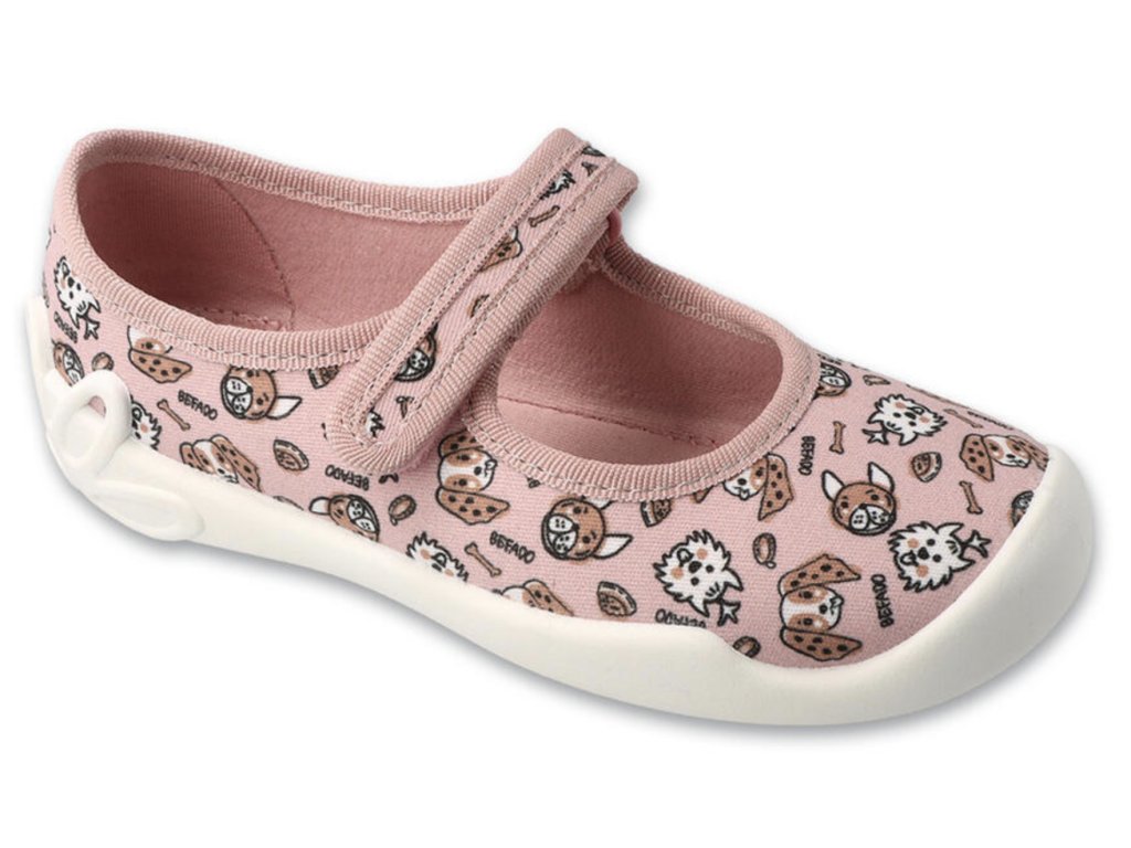 Dívčí bačkory Befado 114X564 růžové s motivem pejsků – pohodlné a lehké přezůvky vhodné do školky i na doma.