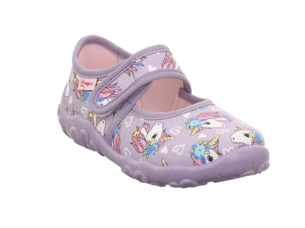 Dívčí bačkorky Superfit Bonny 1-000283-8530 s jednorožcem – lehké a prodyšné, s praktickým zapínáním na suchý zip pro snadné obouvání. Vhodné pro užší až normálně široké nožičky, pohodlné na celodenní nošení doma i ve školce.