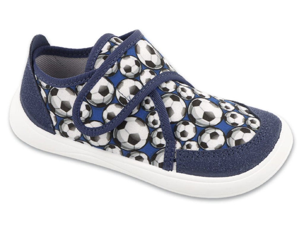 Dětské barefoot boty Befado 140X002 v modrém provedení s motivem fotbalových míčů jsou lehké, flexibilní a pohodlné přezůvky podporující přirozený pohyb, vhodné do školky i na doma.