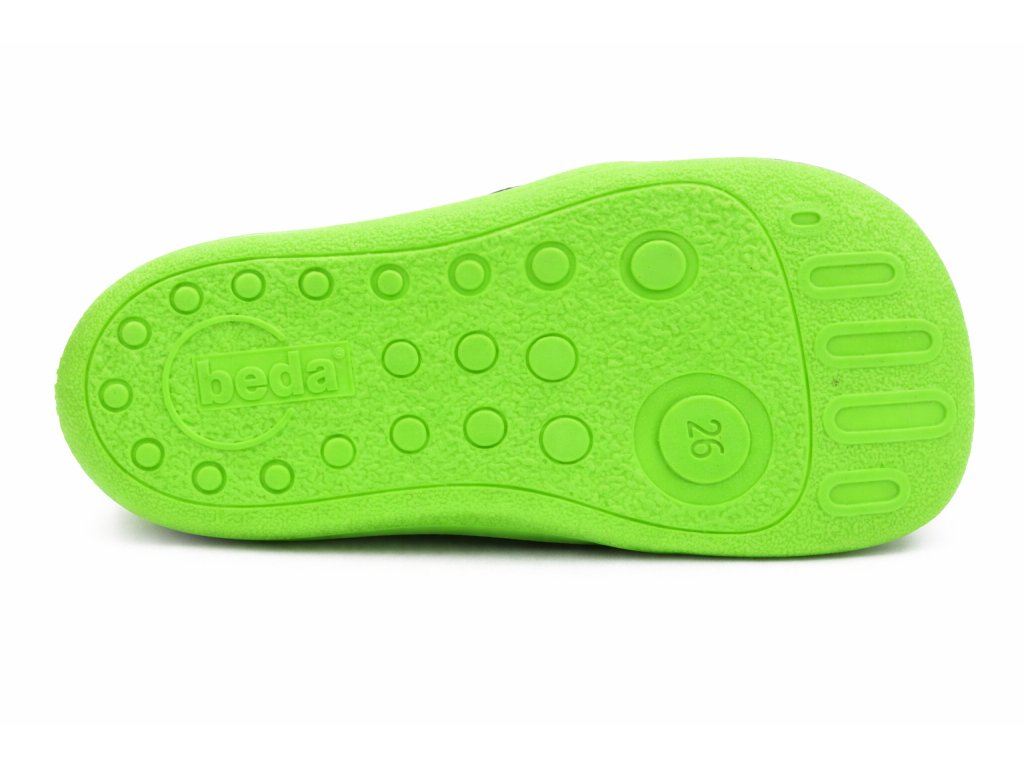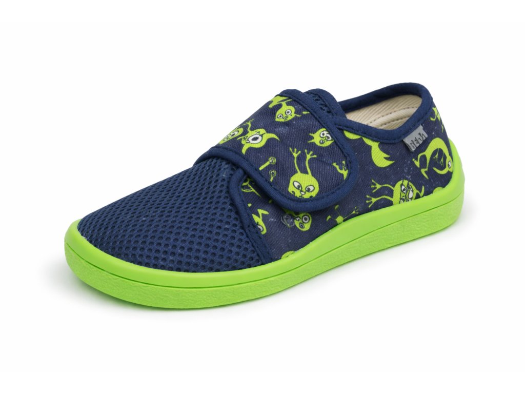 Barefoot modro-zelené tenisky Beda BF 0001/TXS/1W MONSTERS jsou lehké jarní boty ze síťoviny, které skvěle poslouží do města i jako přezůvky do školky či školy. Prostorná špička respektuje přirozený tvar chodidla a poskytuje dostatek místa i širším prstům, zatímco flexibilní podrážka s nulovým dropem podporuje zdravý a přirozený pohyb. Díky praktickému suchému zipu se snadno obouvají a česká ruční výroba zaručuje kvalitní zpracování i bezpečné materiály.