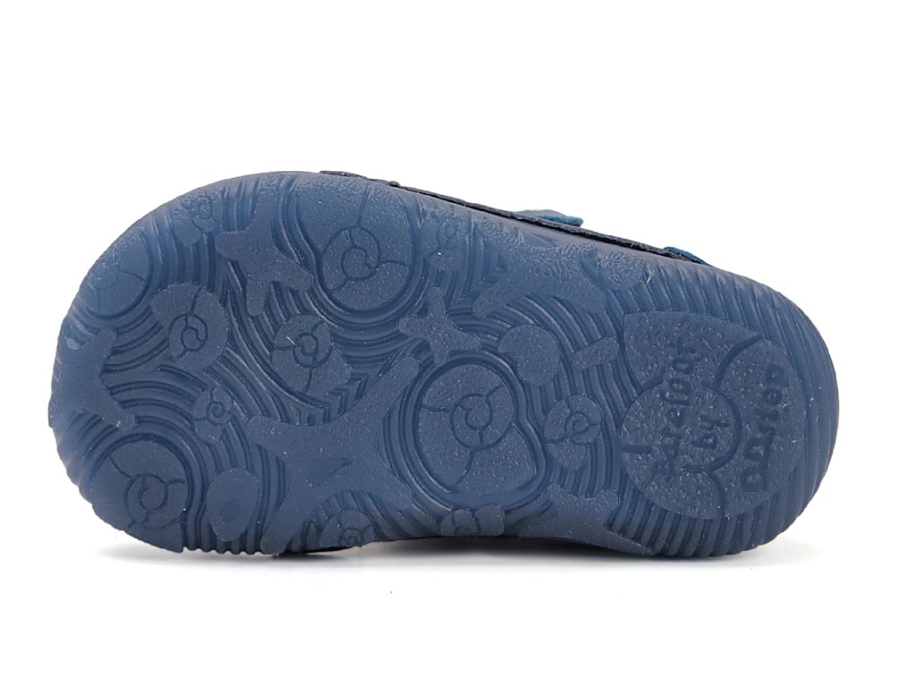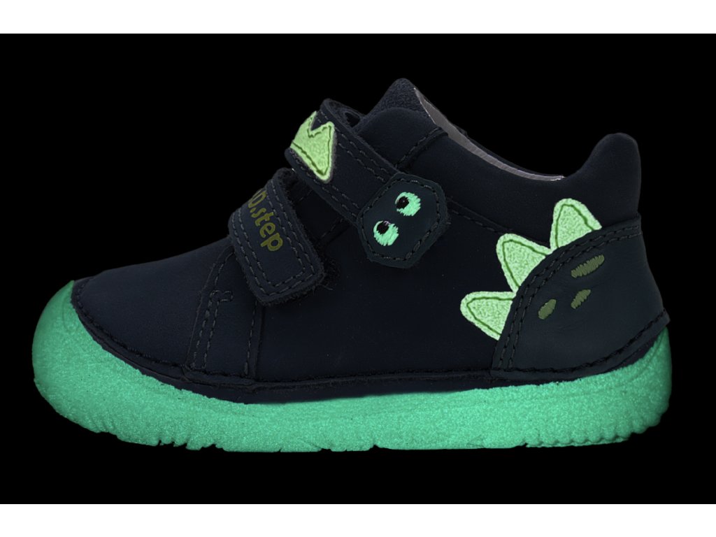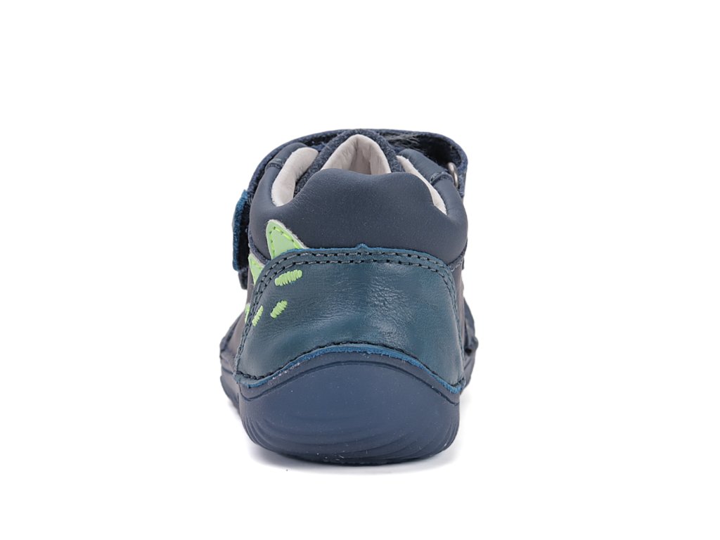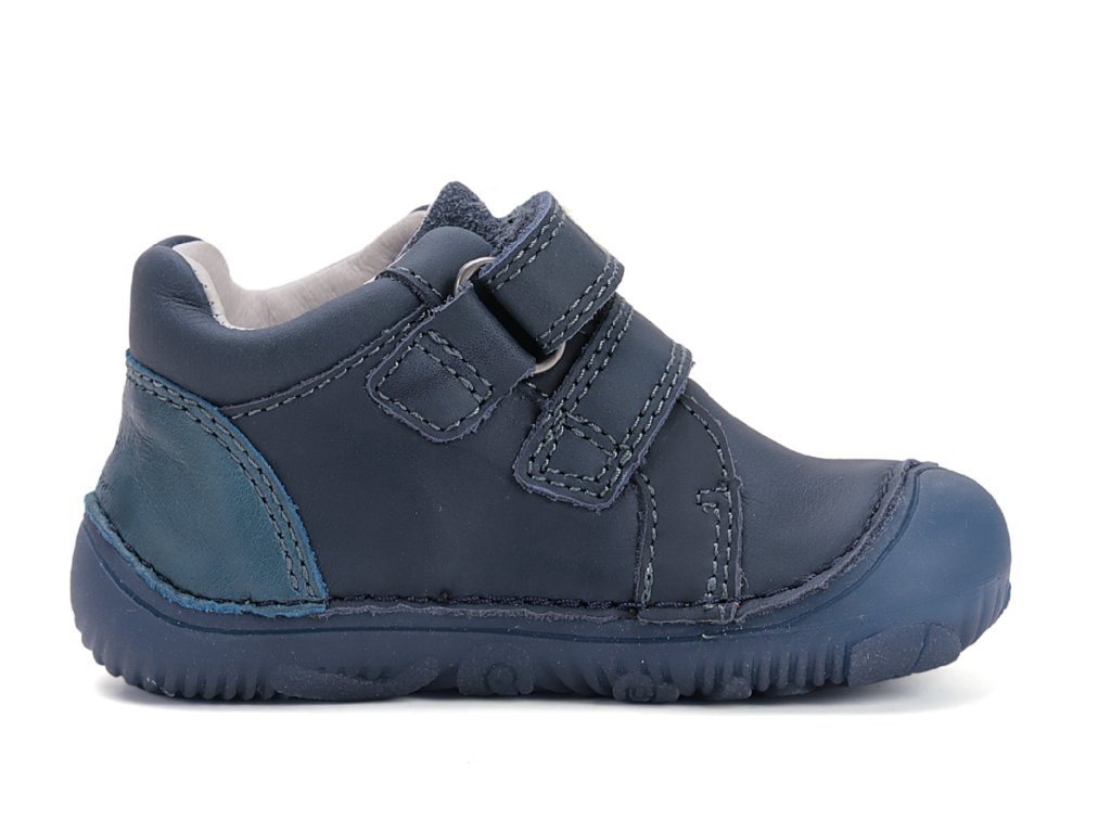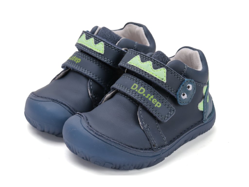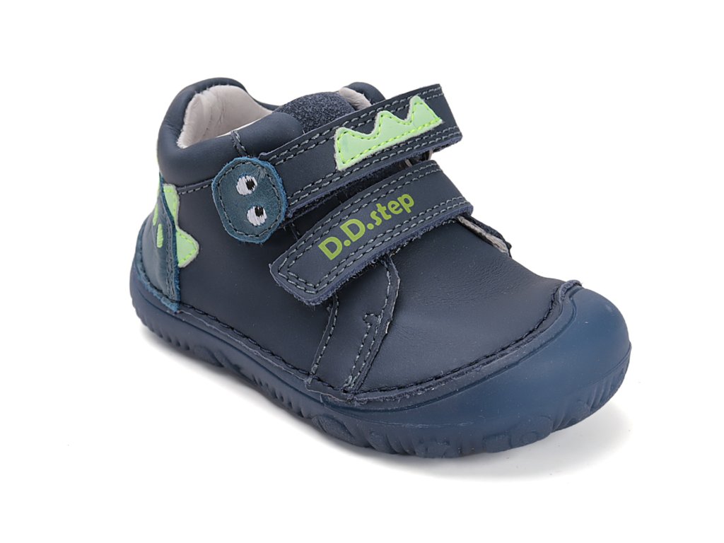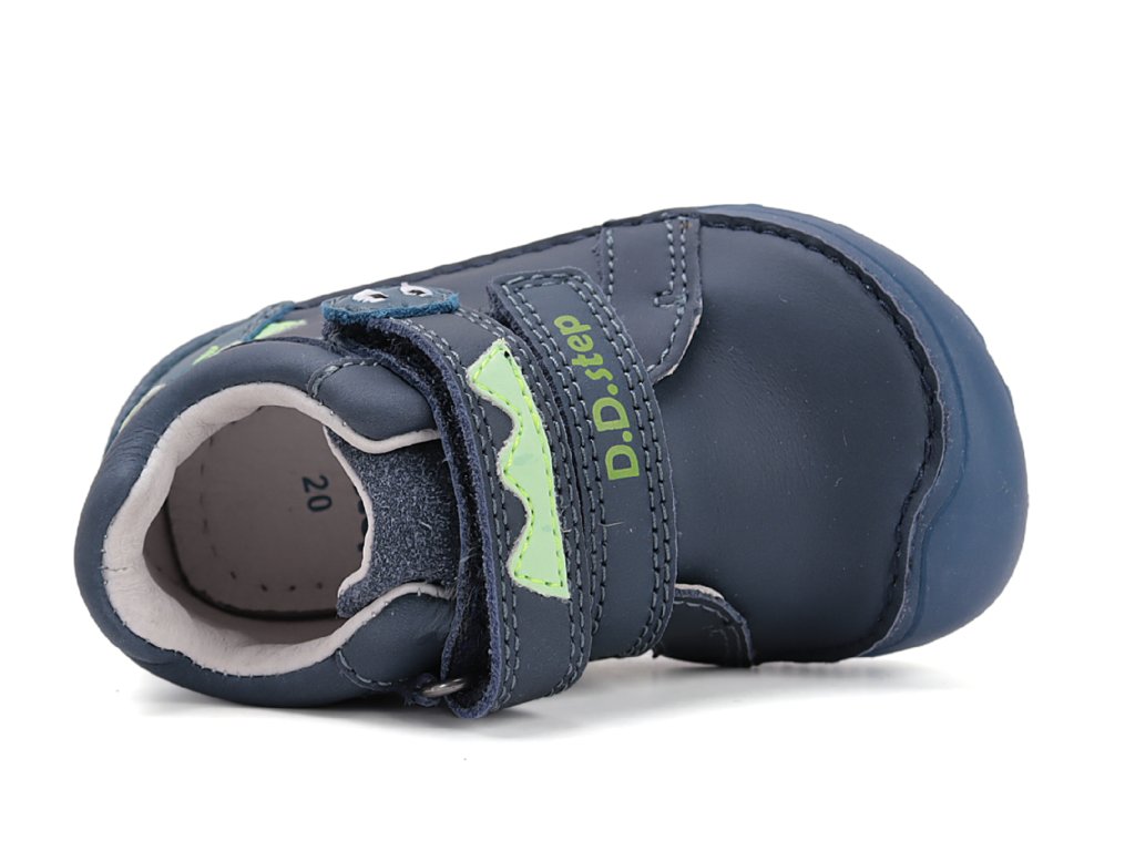 D.D.step S073-52875 v modré barvě jsou chlapecké kožené barefoot boty s flexibilní podrážkou a prostornou špičkou pro zdravý vývoj chodidla. Mírný okop chrání špičku boty před opotřebením. Boty sedí dětem s normální až vyšší šířkou nohy a vyšším nártem. Fosforeskující podrážka je ve tmě viditelná, což zvyšuje bezpečnost dítěte při pohybu za snížené viditelnosti.