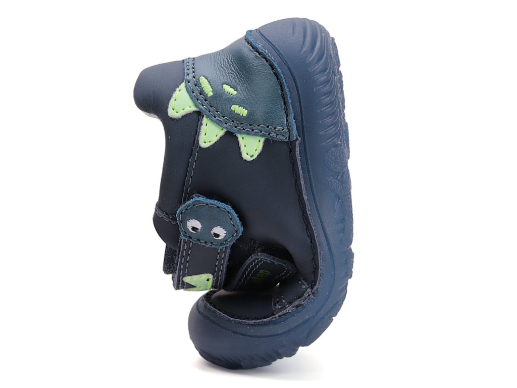 - Opatek a podešev: opatek je nezpevněný, boty jsou měkké a ohebné pro zdravý vývoj nohy. Lehká, neklouzavá syntetická podešev zajišťuje stabilní krok. Mírný okop chrání špičku obuvi před opotřebením. Podrážka fosforeskuje a je ve tmě viditelná, což zvyšuje bezpečnost dítěte.