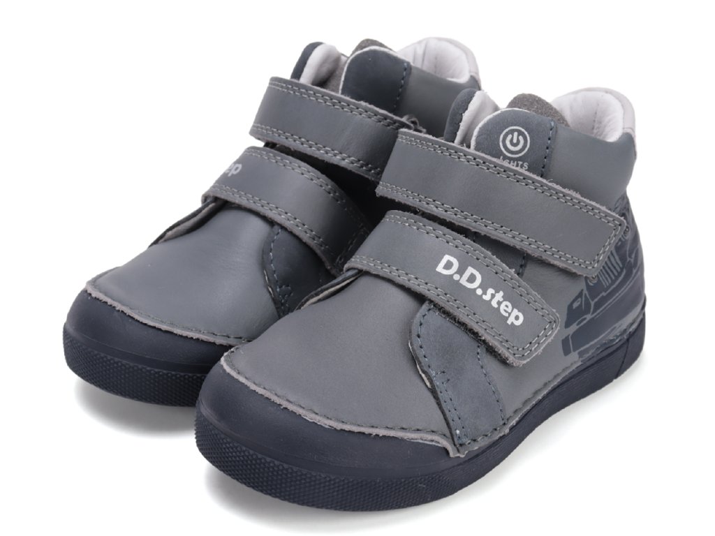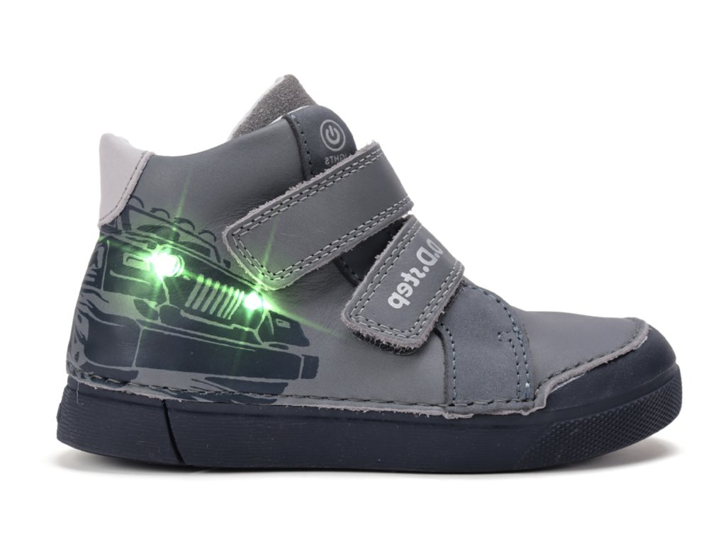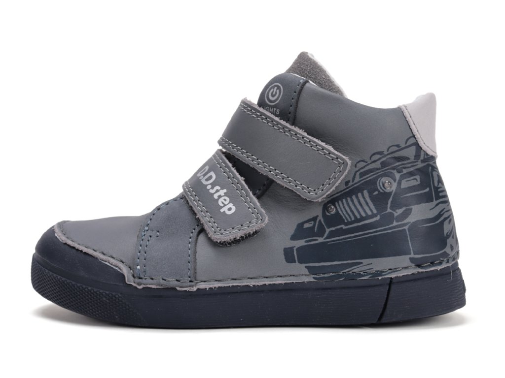 Stylové chlapecké boty D.D.Step A068-52151 Grey s motivem auta a zabudovanými LED světélky v oblasti světel na autě. Při chůzi boty blikají, což děti baví a zároveň zvyšuje jejich bezpečnost za šera i tmy. Praktické zapínání na suchý zip umožňuje snadné obouvání a pohodlné nošení po celý den.
