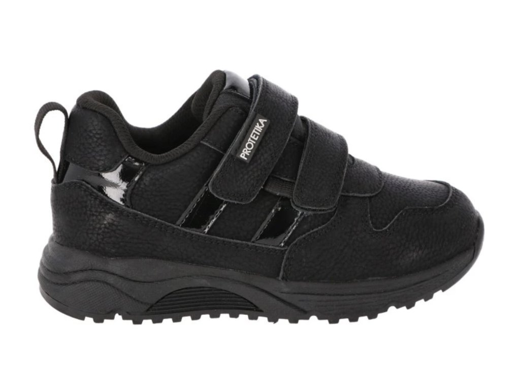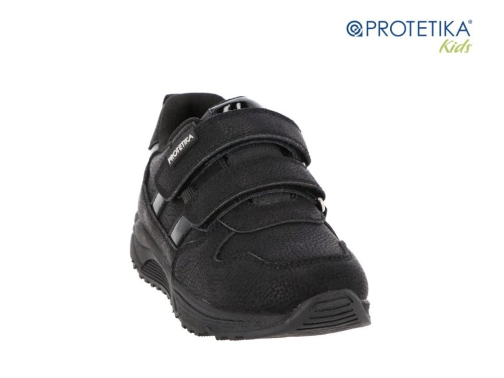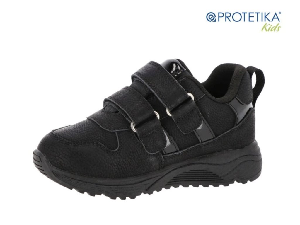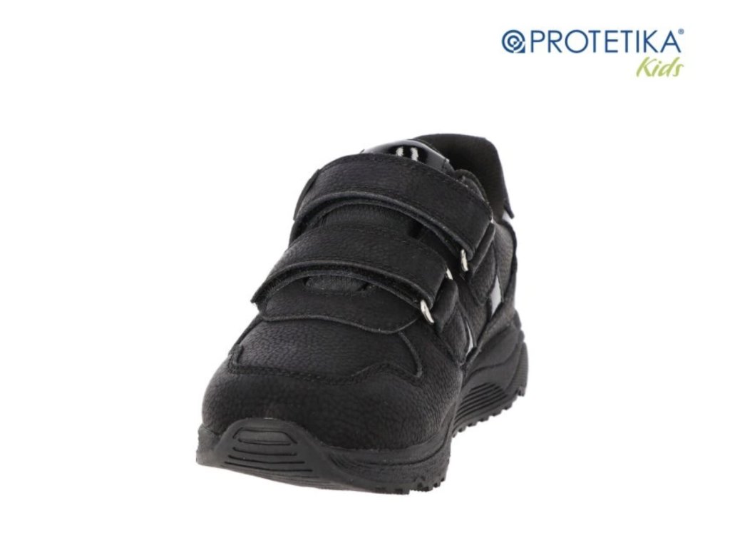 Dívčí boty Protetika Agi v černé barvě jsou pevná kožená obuv s membránou PROTEX proti vlhkosti. Mají vyjímatelnou stélku s podporou klenby, pevný opatek a zapínání na suchý zip. Podešev je zpočátku tužší, ale po krátkém nošení se příjemně přizpůsobí.