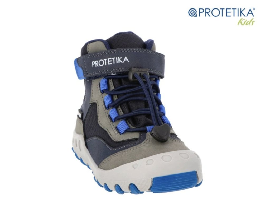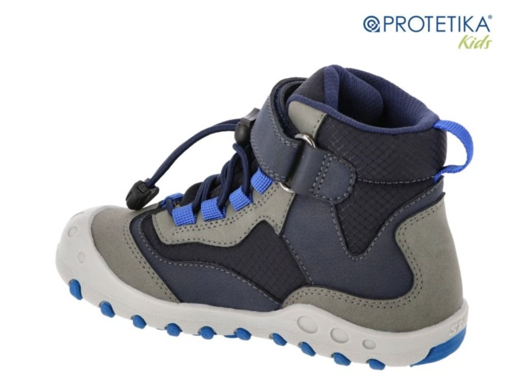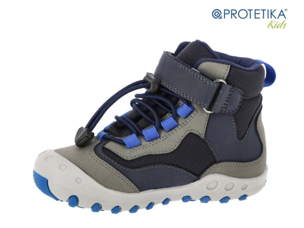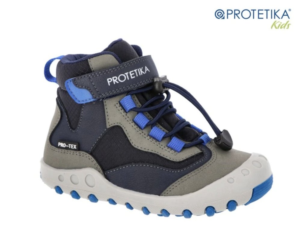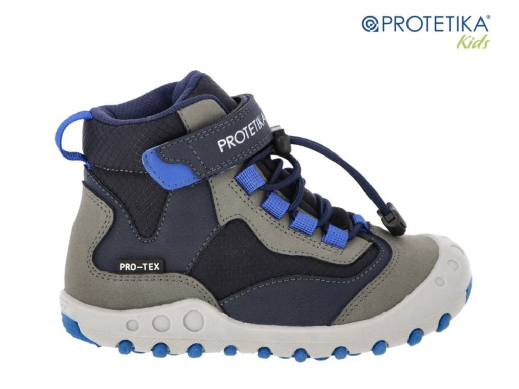 Protetika Hany Navy jsou celoroční outdoorové kotníkové boty vhodné pro každodenní nošení i lehkou turistiku. Díky voděodolné membráně PRO-TEX udrží dětské nohy v suchu a pohodlí i za deštivého počasí. Zpevněný opatek poskytuje stabilitu a oporu, zatímco kompromisní podešev kombinuje výhody barefoot obuvi a klasických bot – umožňuje přirozený pohyb, ale zároveň poskytuje dostatečnou ochranu a tlumení. Vyjímatelná kožená stélka zajišťuje hygienu a komfort, svrchní část z kombinace kůže a textilu přináší odolnost i prodyšnost.