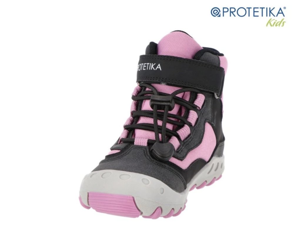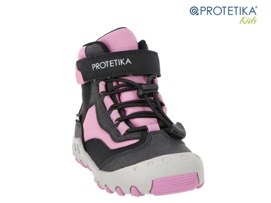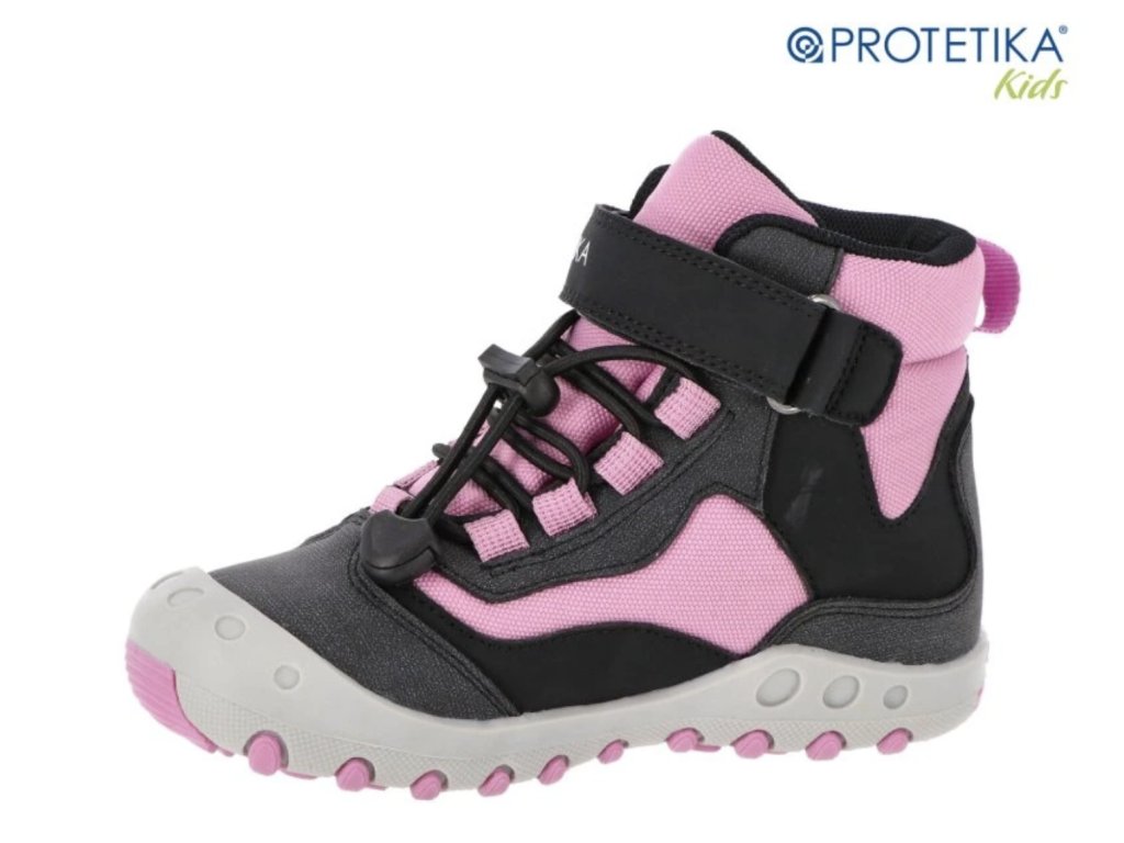 Protetika Hany pink jsou celoroční outdoorové kotníkové boty vhodné pro každodenní nošení i lehkou turistiku. Díky voděodolné membráně PRO-TEX udrží dětské nohy v suchu a pohodlí i za deštivého počasí. Zpevněný opatek poskytuje stabilitu a oporu, zatímco kompromisní podešev kombinuje výhody barefoot obuvi a klasických bot – umožňuje přirozený pohyb, ale zároveň poskytuje dostatečnou ochranu a tlumení. Vyjímatelná kožená stélka zajišťuje hygienu a komfort, svrchní část z kombinace kůže a textilu přináší odolnost i prodyšnost.