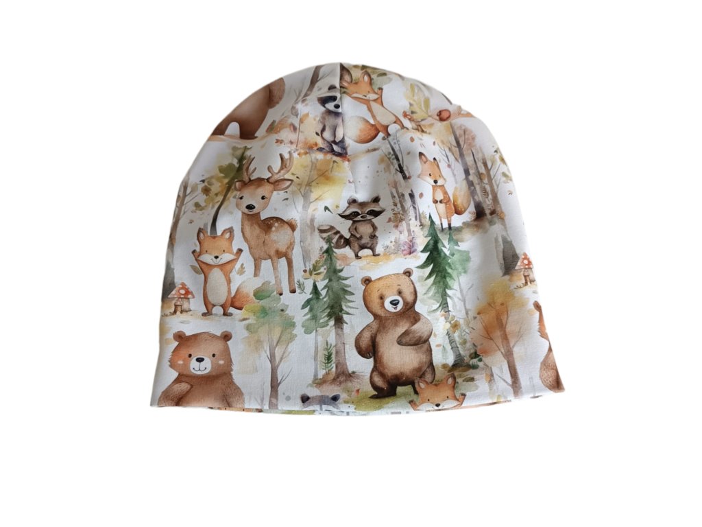 Stylová bavlněná čepice BeRooSh Lesní zvířátka je lehká, pružná a prodyšná — ideální na jaro, podzim i mírnou zimu. Je ušitá z kvalitní bavlny s elastanem s digitálním potiskem a certifikací Öko-Tex Standard 100. Česká originální výroba zaručuje výjimečný komfort a hladkost na dotek.