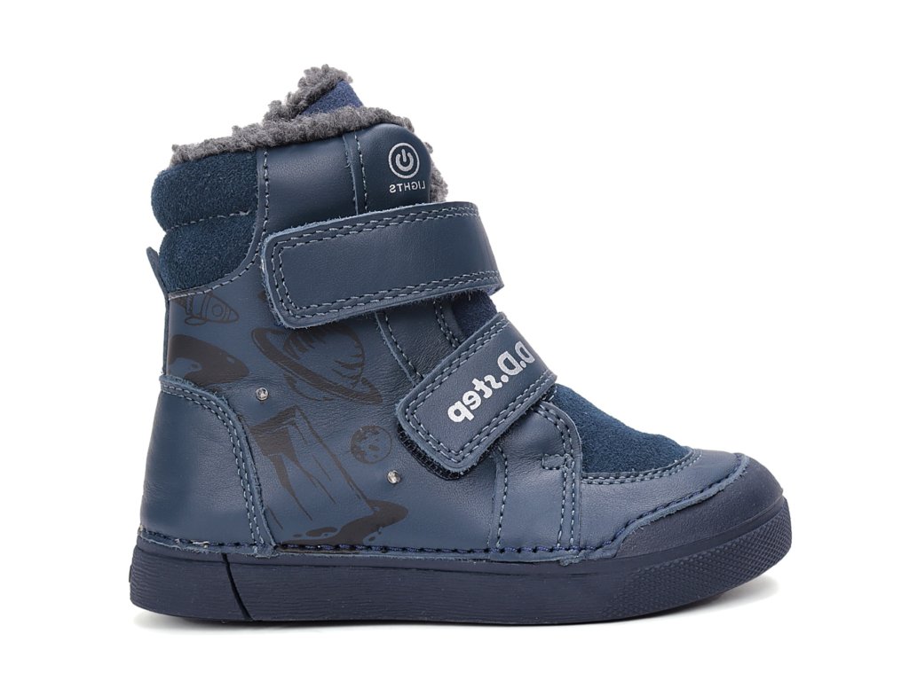 Chlapecké zimní kožené boty D.D.Step W068-52998A modré s motivem planet udrží dětské nožky v teple a pohodlí po celý den. Měkký kožíšek uvnitř poskytuje příjemné zateplení i v chladném počasí. Blikající LED diody se dají vypínat a zapínat, takže děti jsou při chůzi lépe vidět a zároveň mohou šetřit baterku.