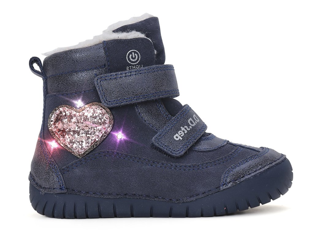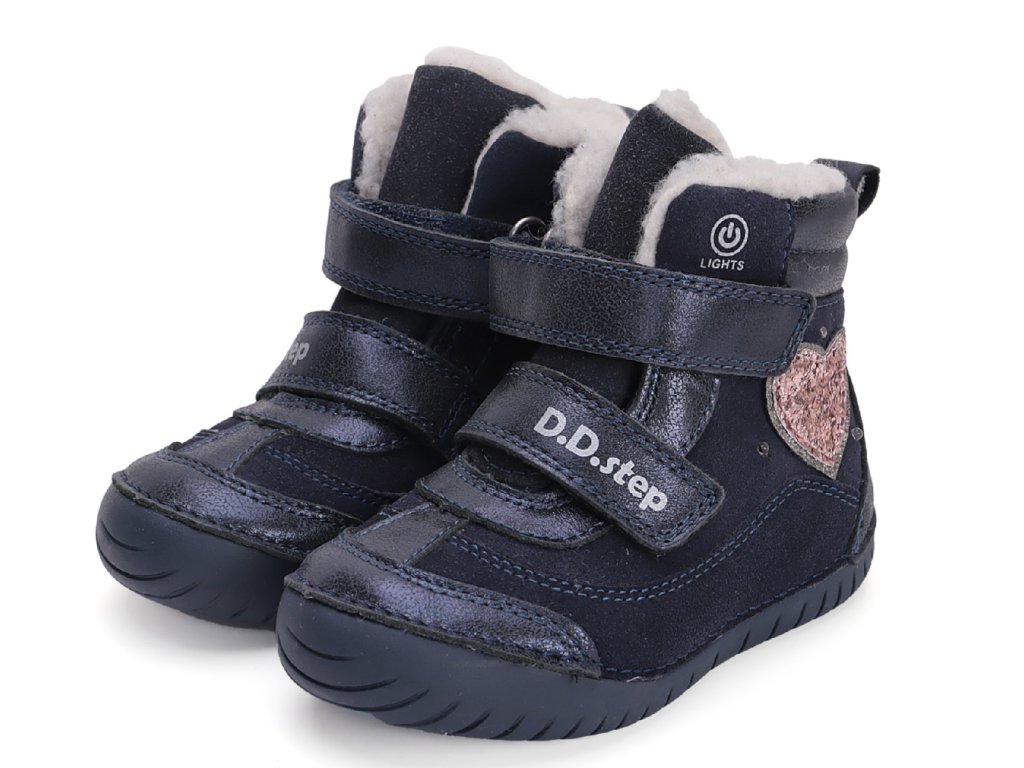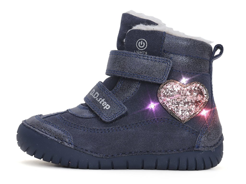 Stylové dívčí zimní boty D.D.Step W050-42707E M Royal Blue jsou zdobené srdíčkem s LED světélky, která při chůzi blikají. LED diody zvyšují bezpečnost tím, že jsou děti lépe vidět ve tmě, a lze je snadno zapnout i vypnout. Boty kombinují design, pohodlí a teplo pro každodenní nošení.