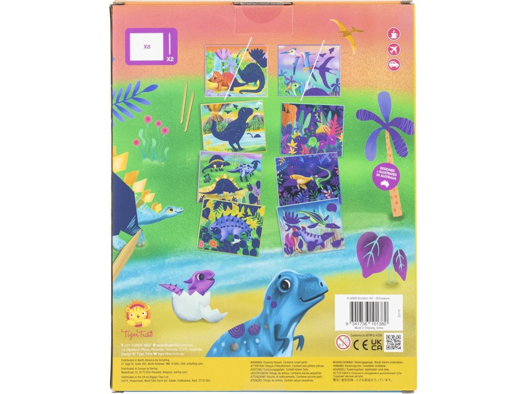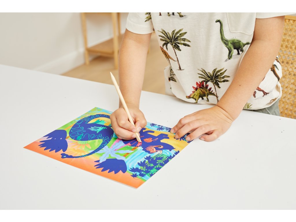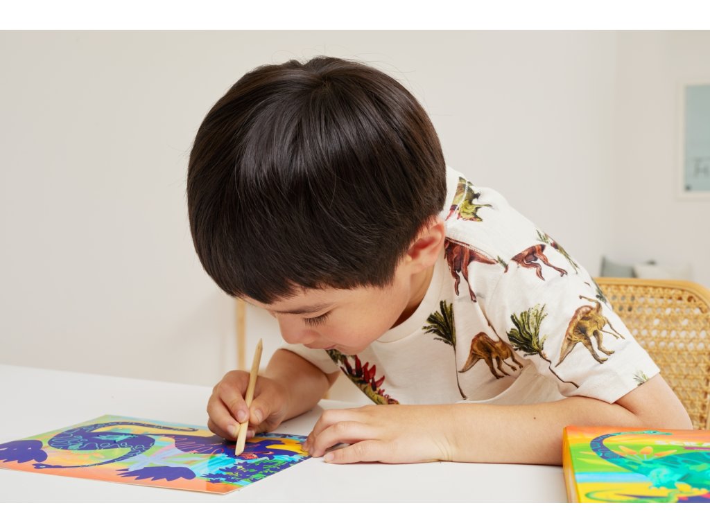 Sada Tiger Tribe Scratch Art - Dinosaurus rozvíjí kreativitu, trpělivost i jemnou motoriku a nabízí dětem originální způsob, jak projevit svou fantazii. Ideální dárek pro malé umělce, kteří milují barvy a objevování!