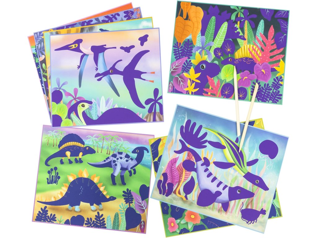 Objevte kouzlo tvoření s Vyškrabávacími omalovánkami Tiger Tribe Scratch Art – Dinosaurus, které děti zavedou do světa dinosaurů. Pomocí přiloženého dřevěného nástroje mohou děti seškrábat části obrázků a postupně odhalovat skryté zářivé odstíny i nové ilustrace.