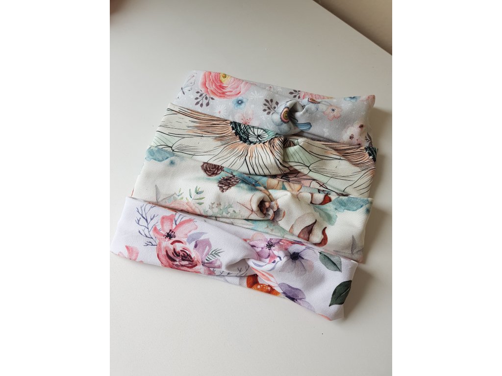 Stylová čelenka do vlasů s efektním překřížením z designové teplákoviny.