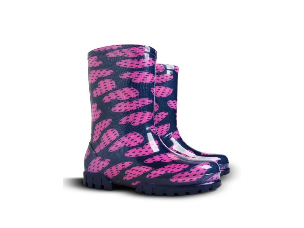 - Stylový design: Dívčí holínky Demar TWISTER PRINT v tmavě modré barvě se stylovými velkými růžovými srdíčky jsou skvělou volbou pro deštivé dny.