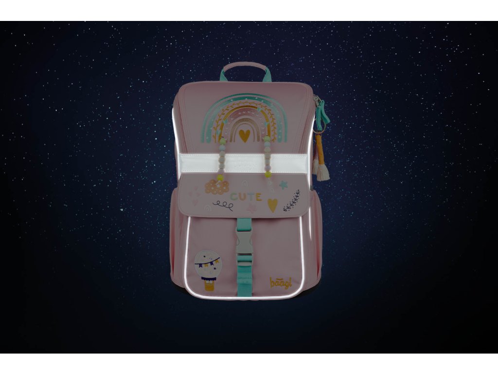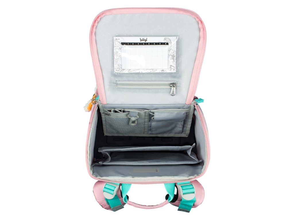 Praktický vnitřní organizér – usnadňuje rovnoměrné rozložení hmotnosti, doplněný gumičkou pro fixaci sešitů a knih.