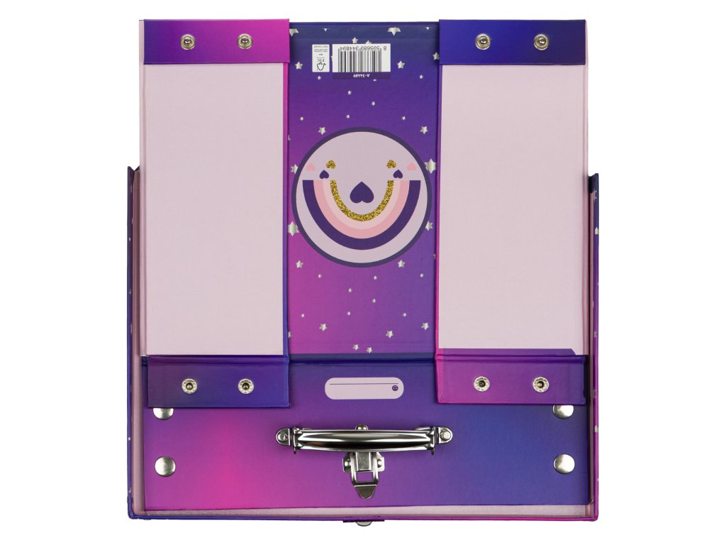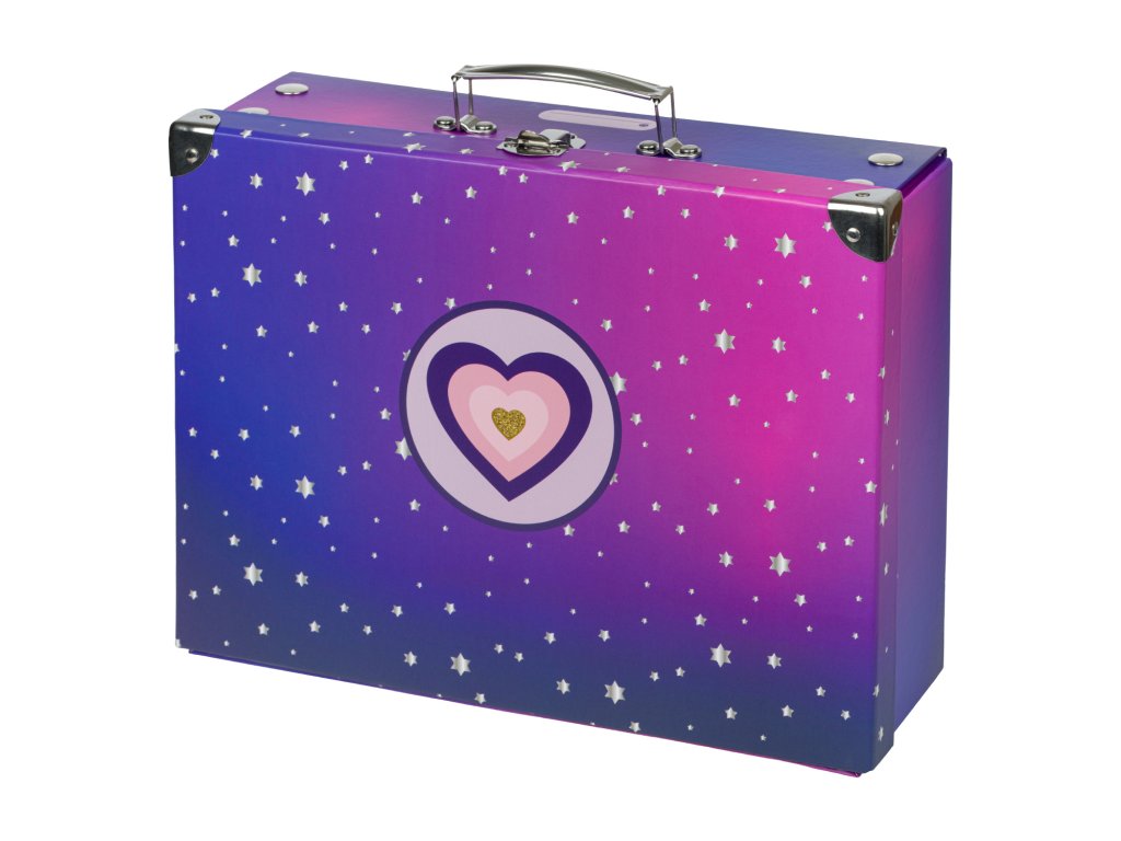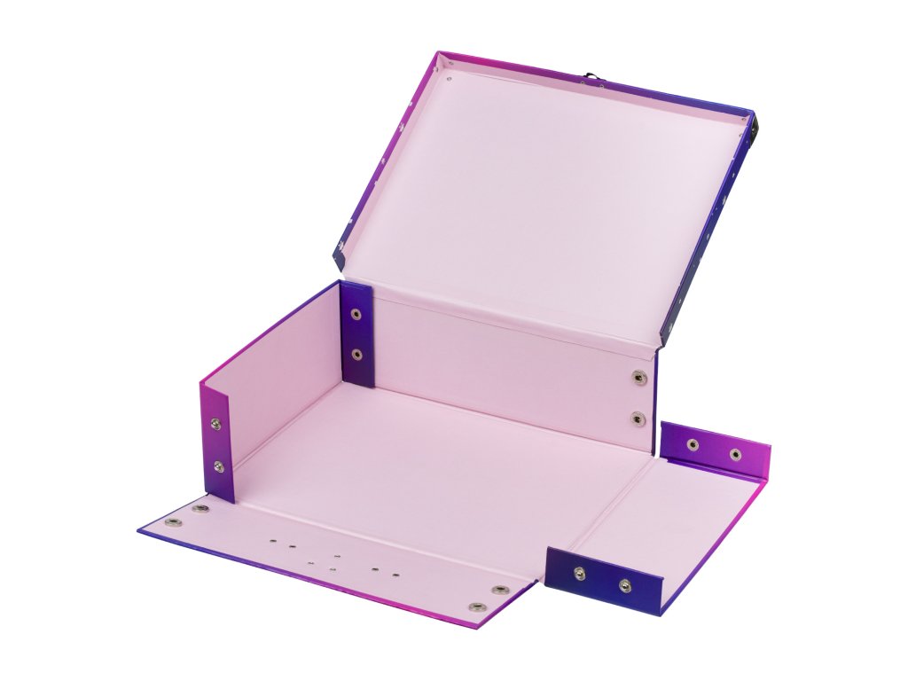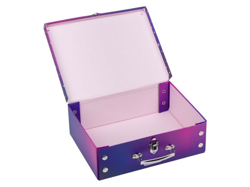 - Skládací kufřík z pevného laminovaného papíru s okovanými rohy.