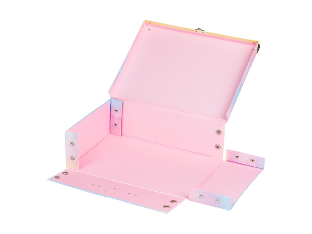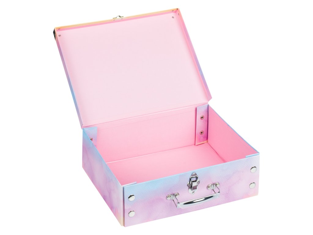 - Skládací kufřík z pevného laminovaného papíru s okovanými rohy.