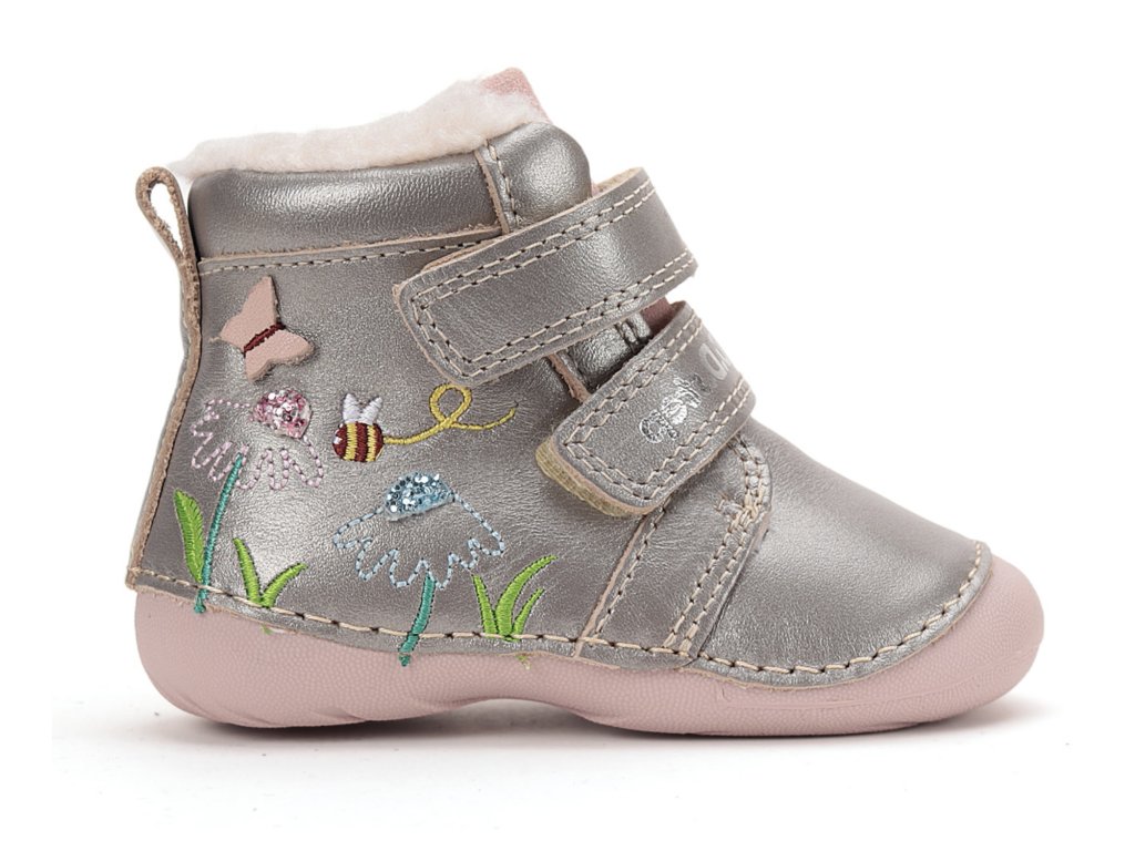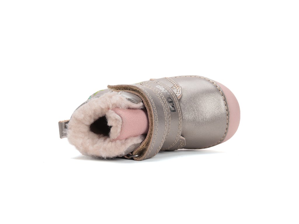 Stylové zimní boty D.D.Step W015-52997a v bronzové barvě s roztomilými kytičkami udrží dětské nožky v teple a pohodlí po celý den. Měkký kožíšek uvnitř poskytuje příjemné zateplení i v chladném počasí. Díky dvěma suchým zipům se snadno obouvají a perfektně přizpůsobí tvaru nohy.