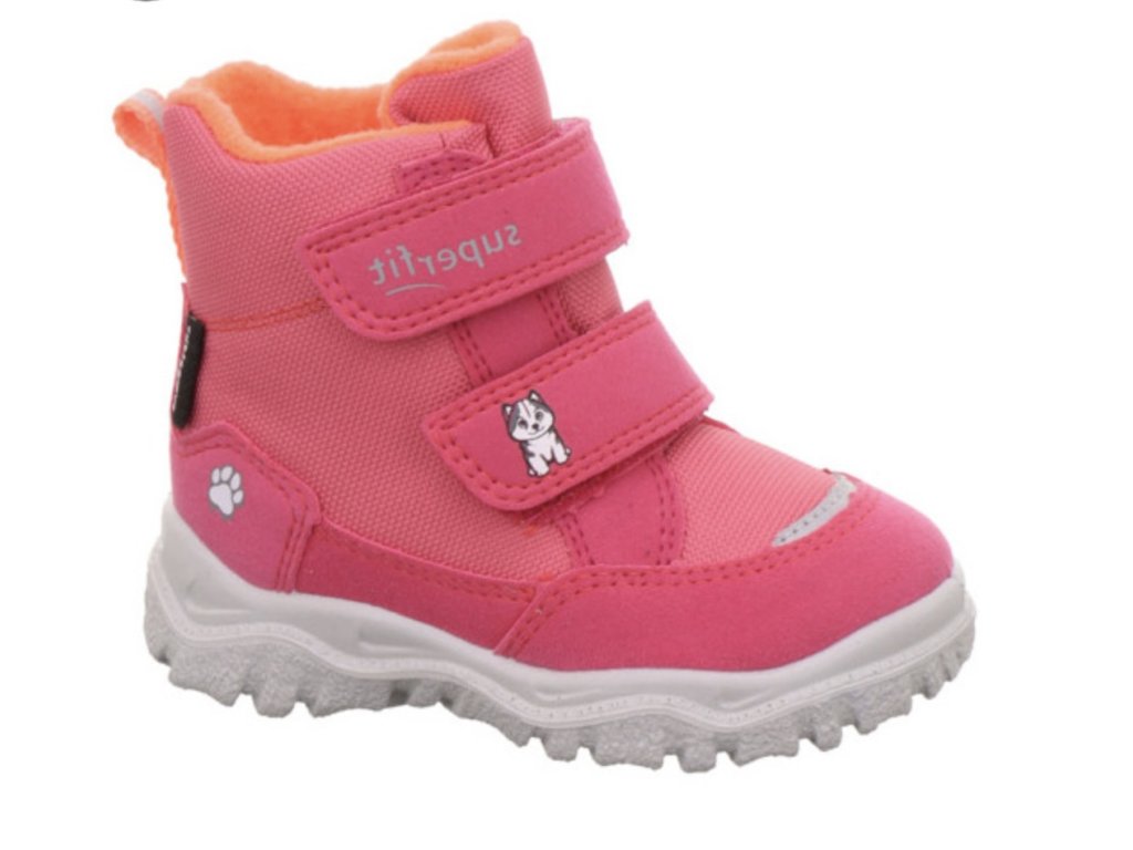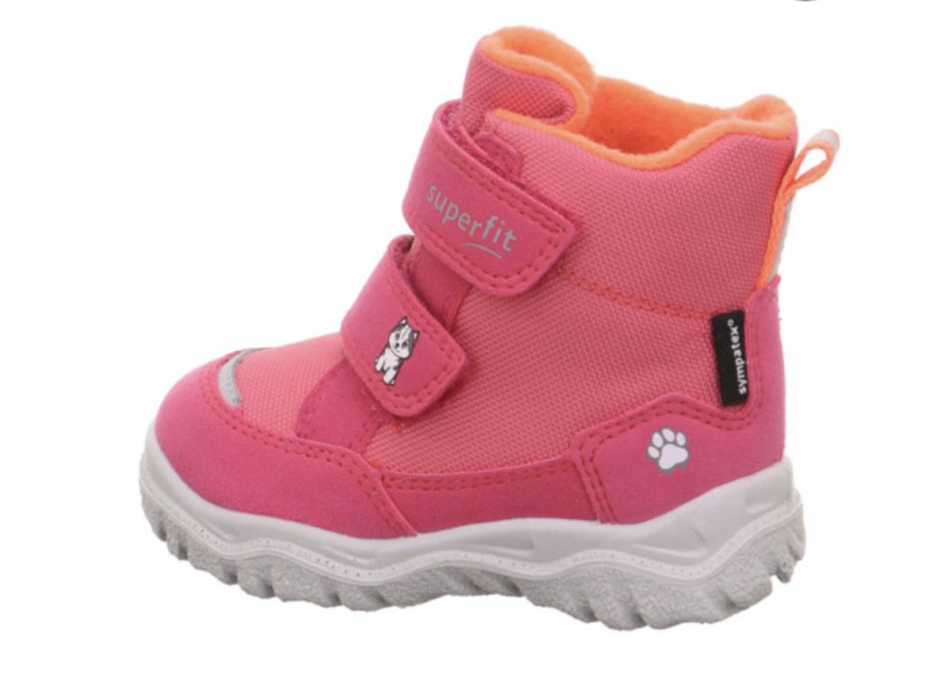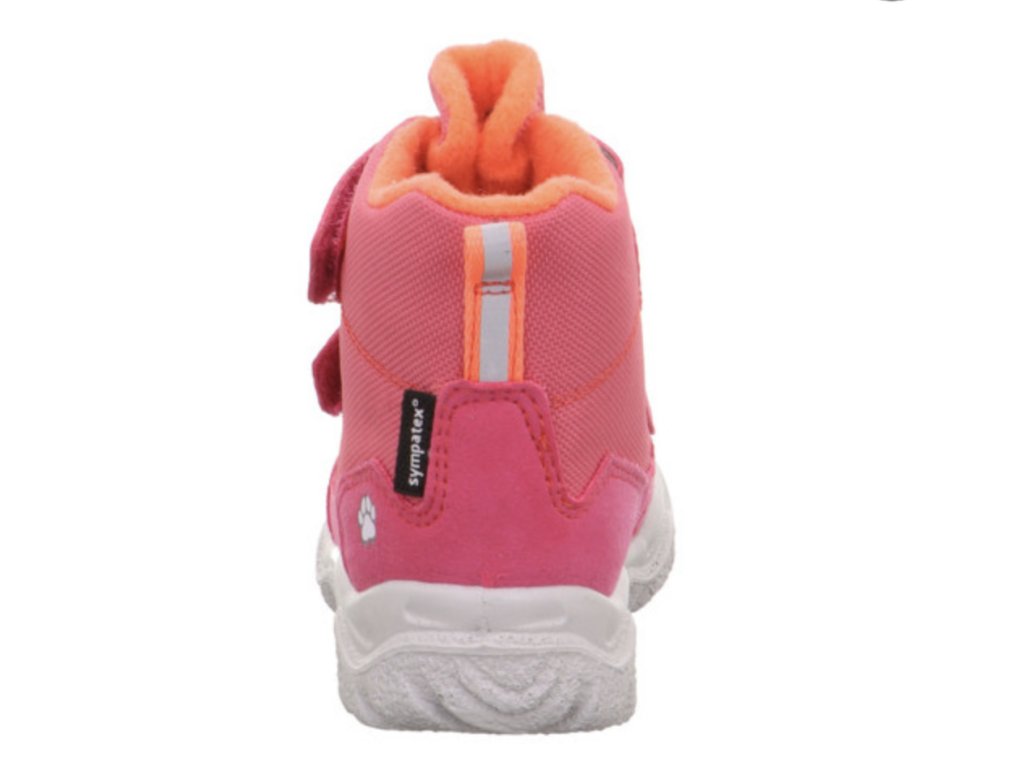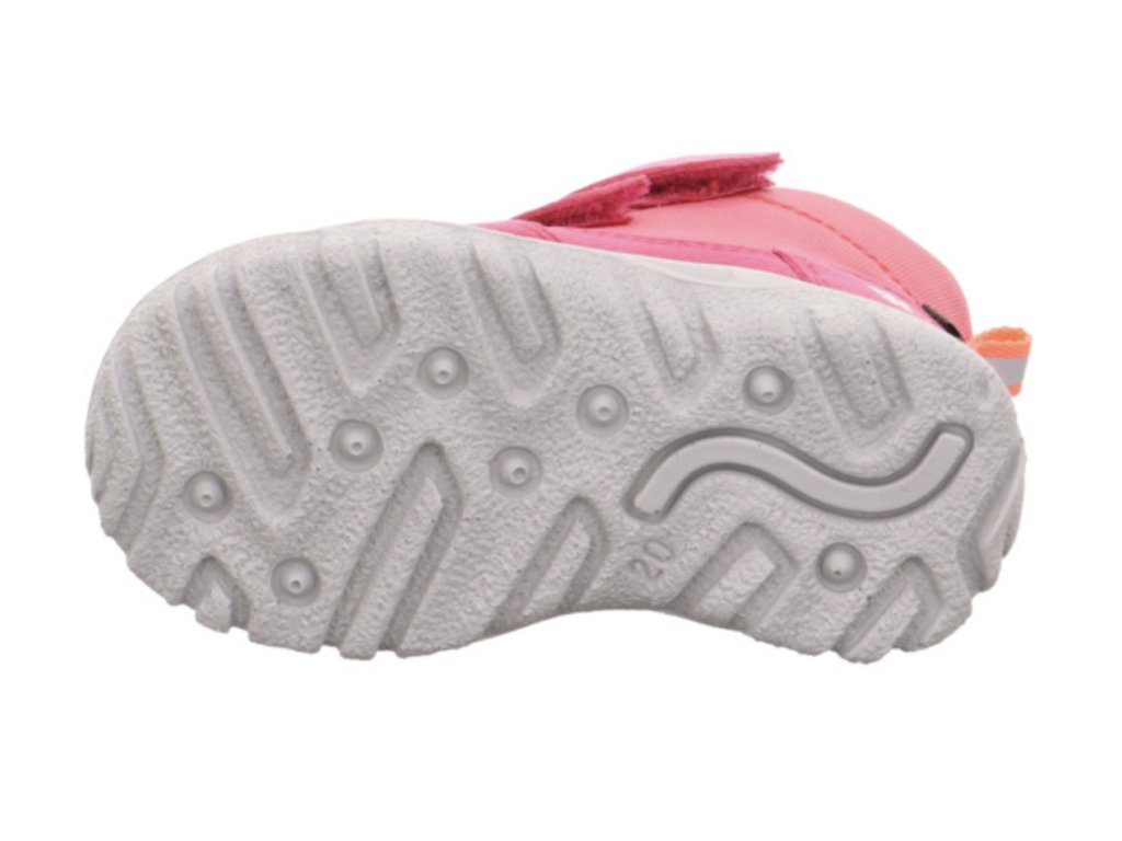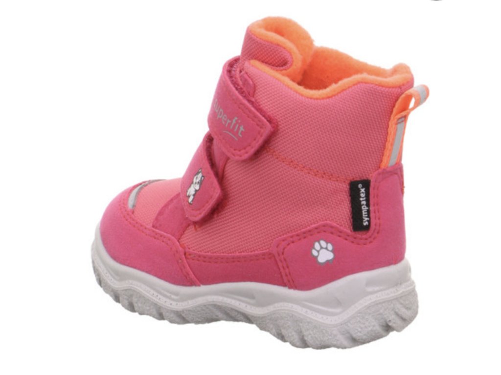 Zateplené zimní dětské boty Superfit Husky1 šíře M v růžovo - oranžové barvě s membránou Sympatex udrží nožky v suchu a pohodlí i v mrazivém počasí. Lehká a ohebná podrážka s protiskluzovým vzorkem zajišťuje stabilitu na sněhu i ledu. Díky dvěma suchým zipům se boty snadno obouvají a dobře přizpůsobí noze.